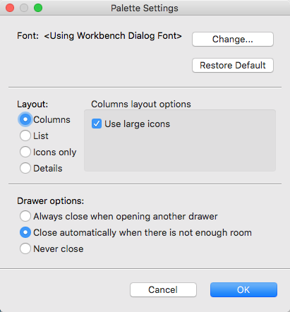 Drawer options: Specifies whether you want Palette drawers to stay opened after use.