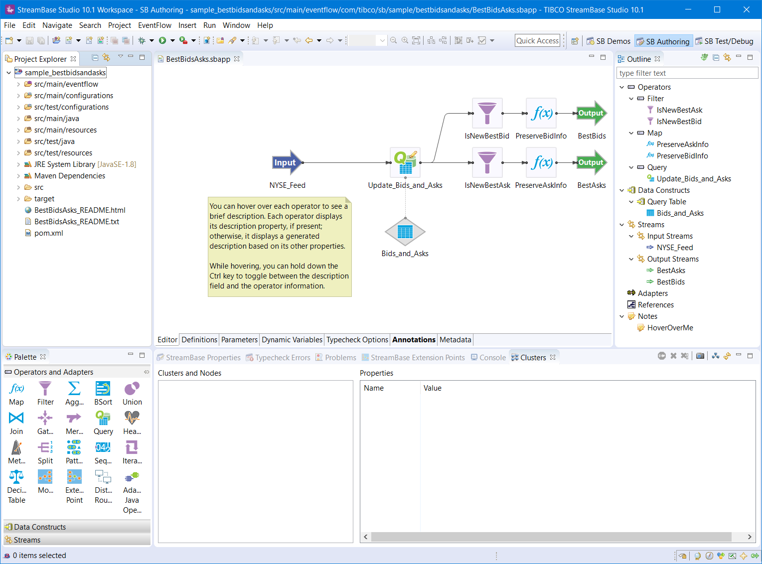 You can resize the individual windows and StreamBase Studio saves your display preferences. The following screen shows the default SB Authoring layout, with an EventFlow editor session active: