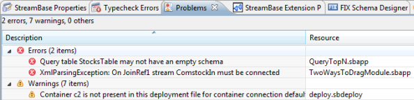 The Problems view is provided as a standard part of Eclipse, and is not a StreamBase-specific view. Nevertheless, StreamBase® Studio takes advantage of the Problems view.