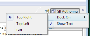 To change the docking location of the Perspective Bar, right-click the Open Perspective button. In the Dock On list (shown in the next figure), select Top Right, Top Left, or Left.