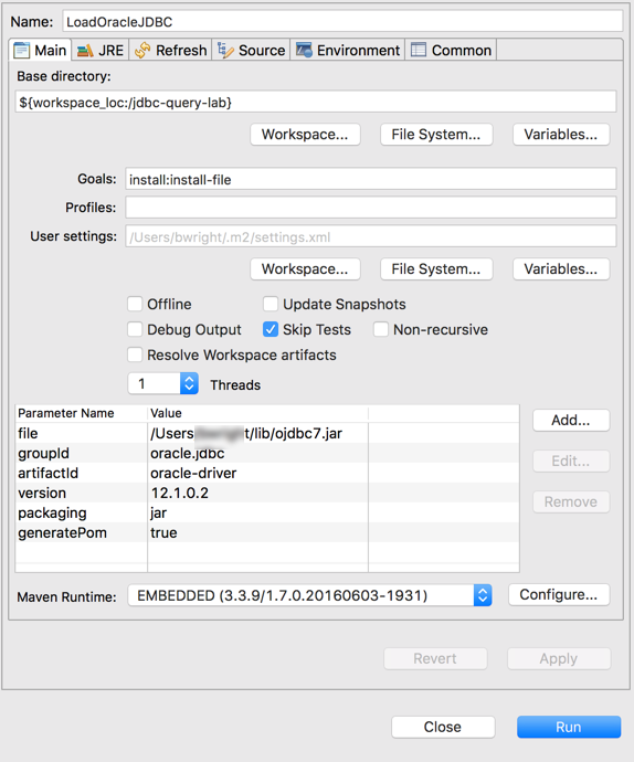 The next image shows a Run Configuration used to load an Oracle JDBC JAR file.