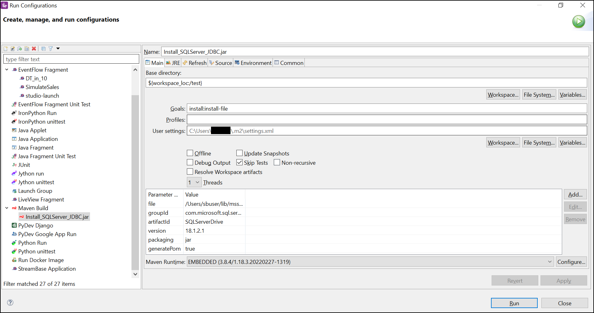 You must install required JAR files to the Maven system for your EventFlow or LiveView project in one of several ways. This article explains one such method: how to use a Run Configuration in StreamBase Studio to install an external JAR file to your local Maven repository. See External JAR Installation Options to learn about other ways to install external JAR files.