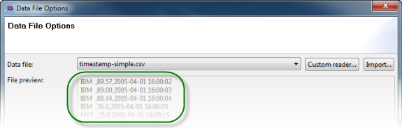 In many cases, the column mapping and timestamp conversion options in the Data File Options dialog are flexible enough to adapt or convert any format CSV file for use as a feed simulation input. Most data feeds can be converted to CSV format. You only need to consider writing a custom file reader is cases where your data feed is available in a proprietary or binary file format and converting to CSV would slow down the feed simulation, or when you need to adjust a non-standard CSV file.