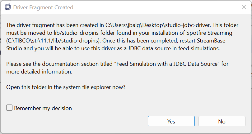 The Driver Fragment Created dialog appears. Click Yes to open the created folder in your system's file explorer.