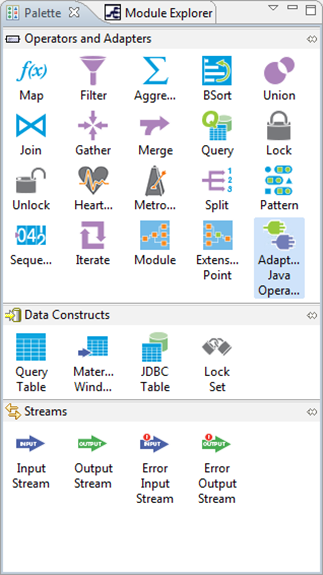 In release 7.4, the palette icons for Java Operators, Input Adapters, Output Adapters, and the .NET operator have been removed. Instead, find all those items by dragging the Global folder in the Insert Operator or Adapter GUI and then clicking .
