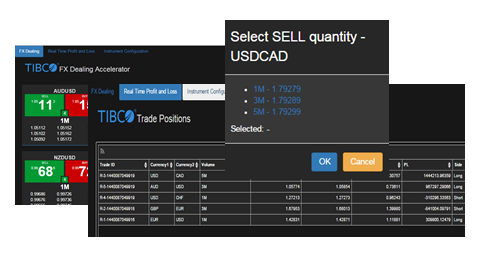Sample JavaScript Pricing/Trading GUI: The FX Dealing UI is a sample user interface for FX dealing, built in JavaScript / HTML5. It provides a visual representation of aggregated FX market data, FX price spreads, top of book, and a point-and-click interface to set FX prices for an FX dealer. The UI is intended to be extended by TIBCO customers and is provided as a fast start.