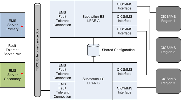 You can configure Substation ES to talk to one or more Enterprise Message Service servers, a Fault Tolerant (FT) Enterprise Message Service pair, or both, and configure each of them separately within a single address space.