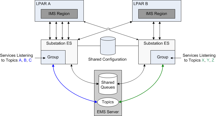 The following figure shows a sample configuration of Substation ES in an IMS Sysplex environment:
