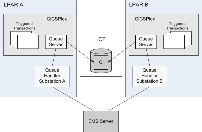 The externally initiated “fire and forget” to TD or TS queue shares the same architecture for the preceding scenarios, except that the inbound data is written to a CICS TS or TD queue. The TD queues can be local to that AOR or shared with another AOR.