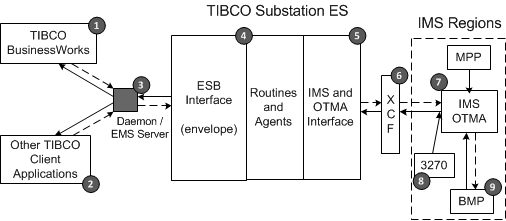 - After Substation ES IMS Interface (5) is notified of the message from XCF (6), it consumes the information from OTMA (7).