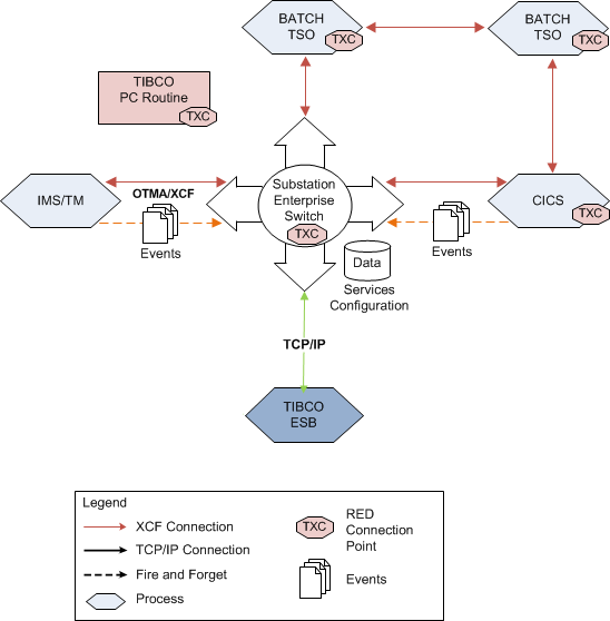 The Substation RED Interface does not replace the existing CICS or IMS Transactional interfaces but adds value, and provides performance and flexible features on top of those existing interfaces. It also allows batch and TSO programs to easily participate in z/OS to z/OS communications or bi-directionally in a z/OS to Enterprise Service Bus environment. The following figure shows Substation ES and TIBCO Mainframe RED architecture: