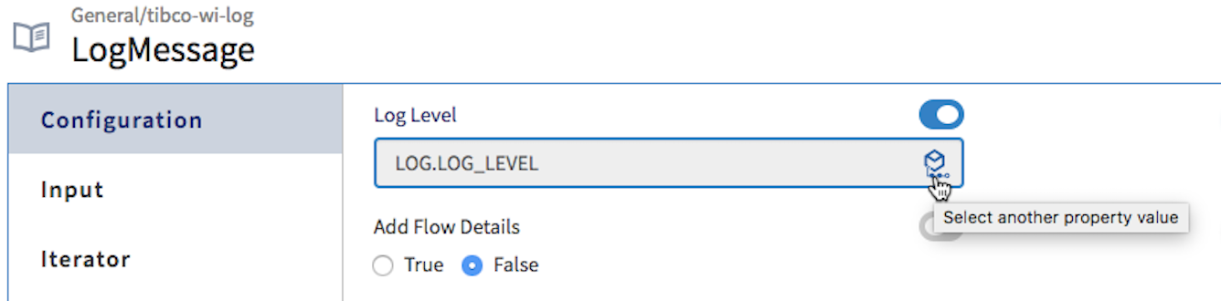 Configuring a field with an application property is recommended for fields that require their values to be overridden when the app goes into production. Hence, the decision as to which fields in an activity should support application properties (which fields can be configured using an application property) must be decided at the time when the extension for the category is being developed. The fields that can be configured using an application property display a slider button against their names in the UI.