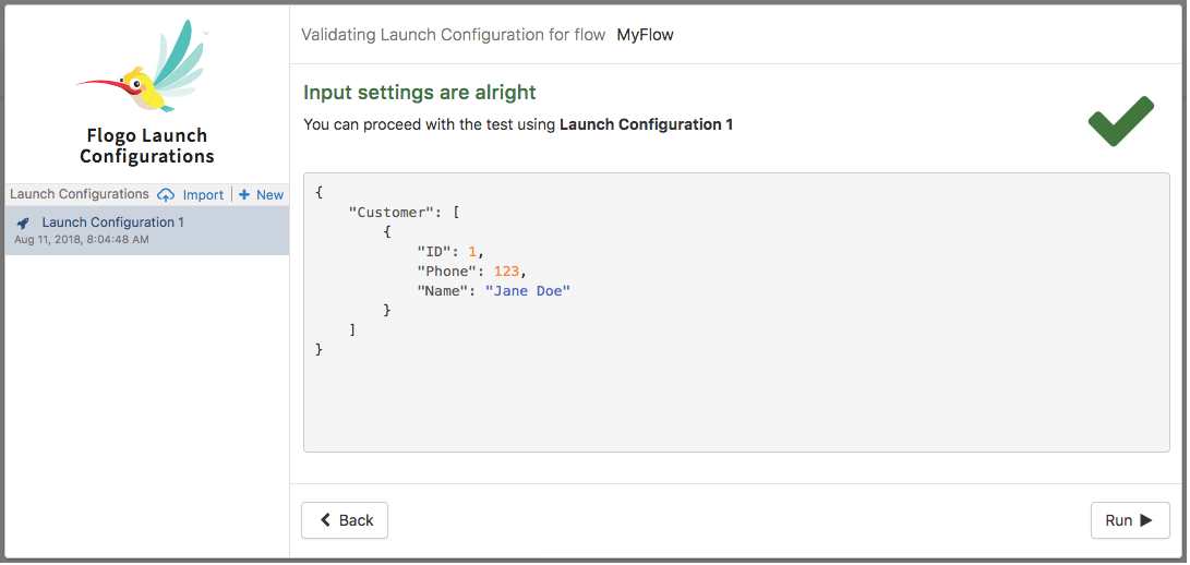 Run to execute the flow with the data you provided in the Launch Configuration.