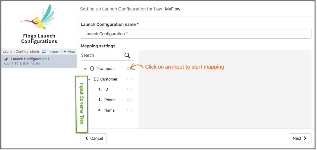 The Flow tester opens with the left pane displaying the Launch Configuration name (by default, a new Launch Configuration is named Launch Configuration x where x stands for a number. For example, since this is the first Launch Configuration that you are creating, the name of the Launch Configuration displays as Launch Configuration 1. The next Launch Configuration you create will be named Launch Configuration 2 by default) The right pane opens the mapper which displays the flow input tree.