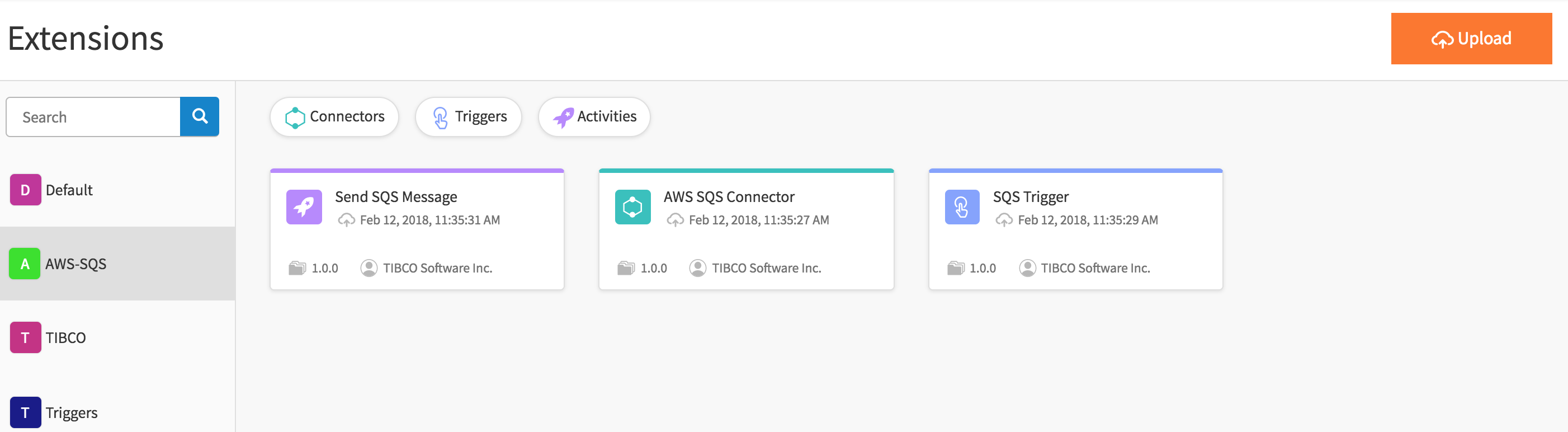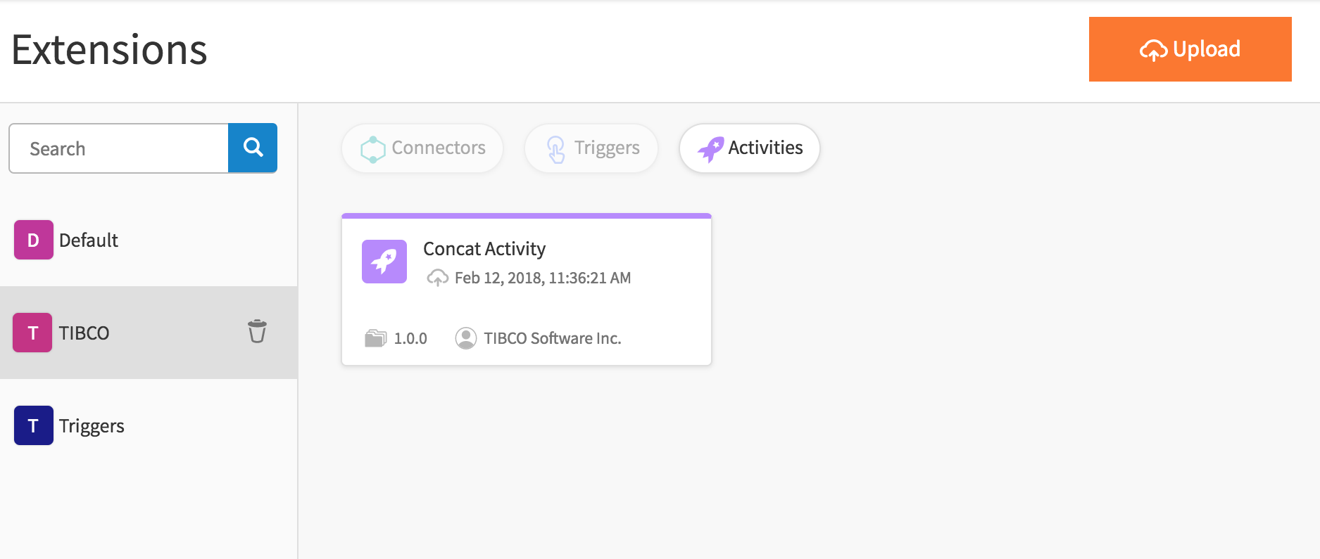You can view your extension on the Extensions page. The newly added extension appears under the category that you specified. If you had not specified a category for the extension, it appears in the Default category. The activities are denoted by the