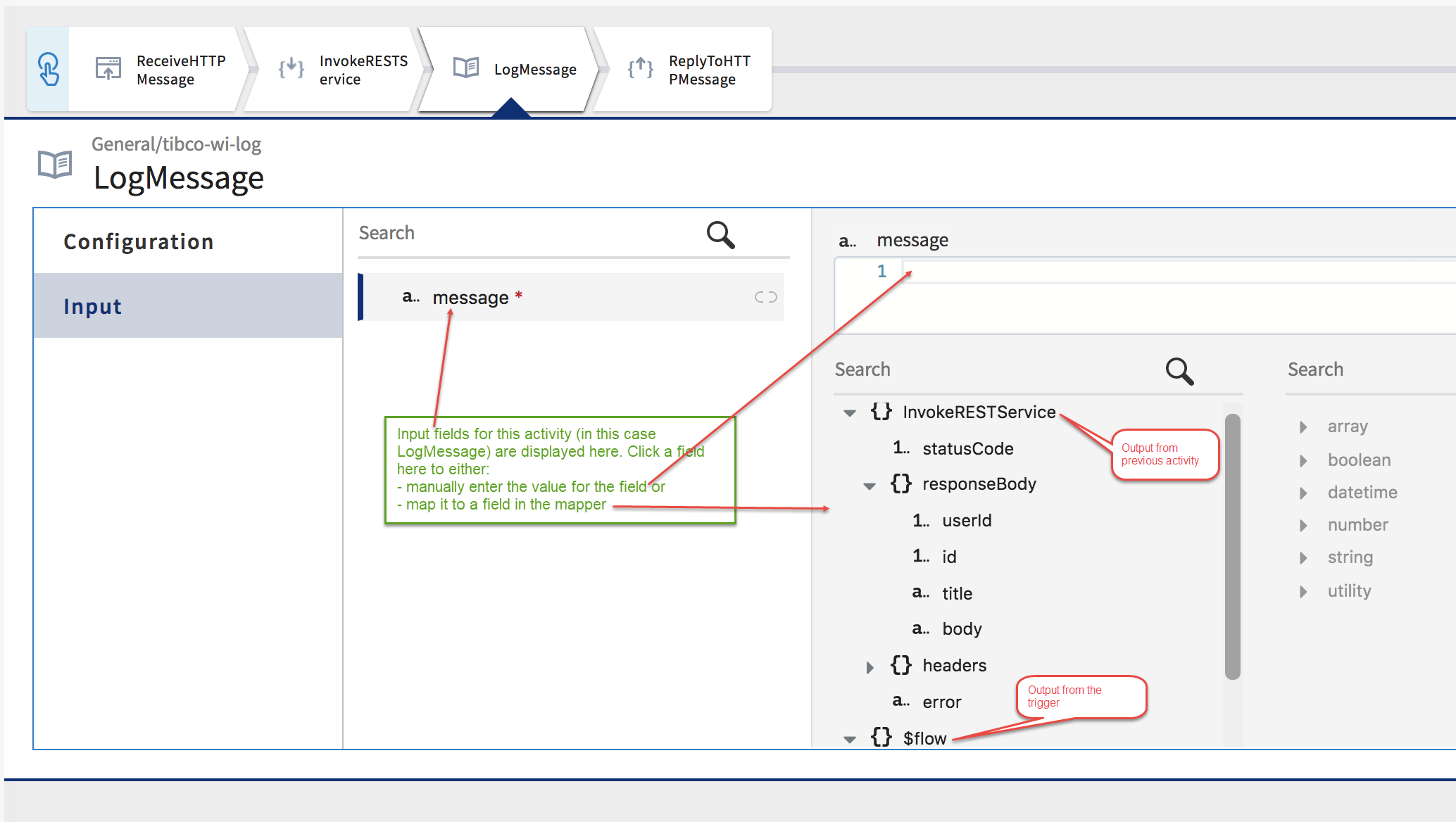 In the example above, to map the message field in the LogMessage activity Input tab, you would need to do the following: