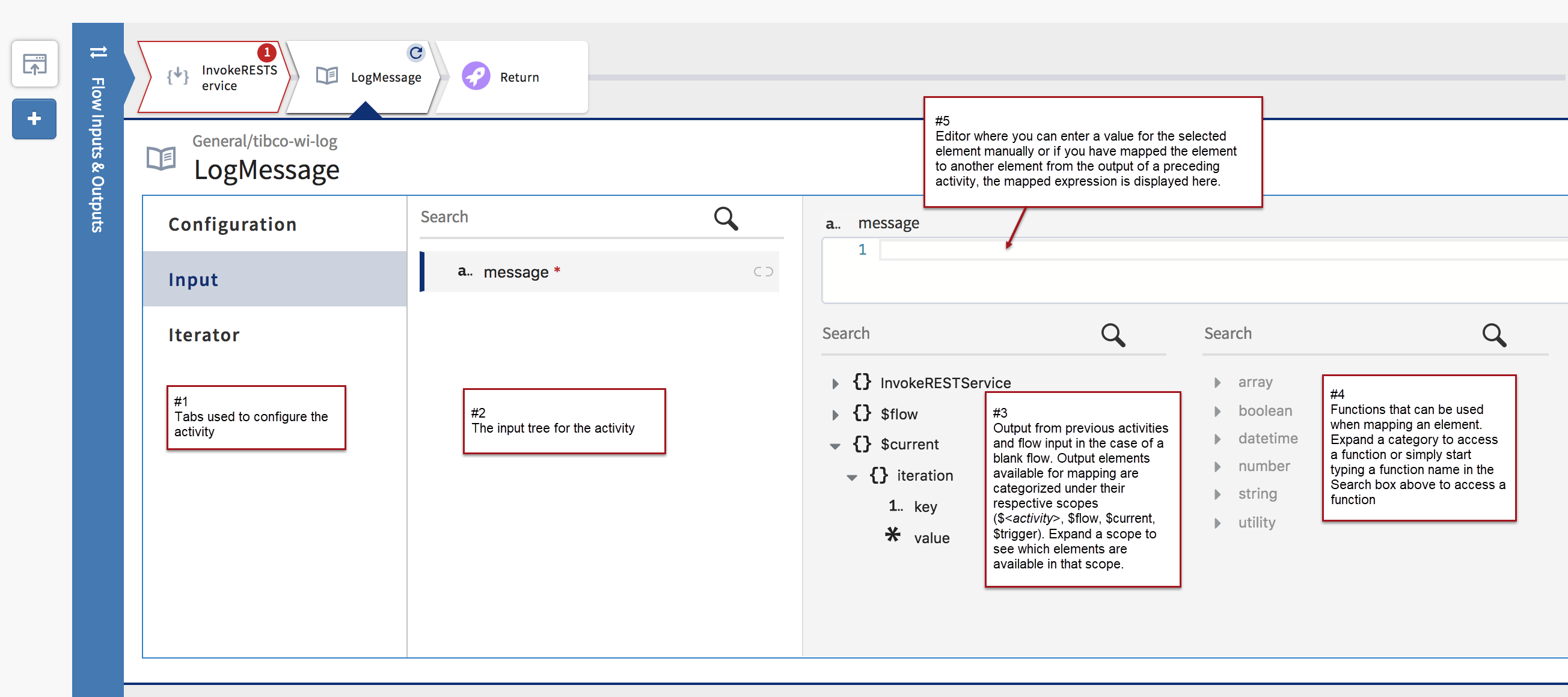 - The pane next to the tabs pane displays the input tree for the elements in the current activity that can be mapped to the output of a preceding activity, trigger, or flow input.