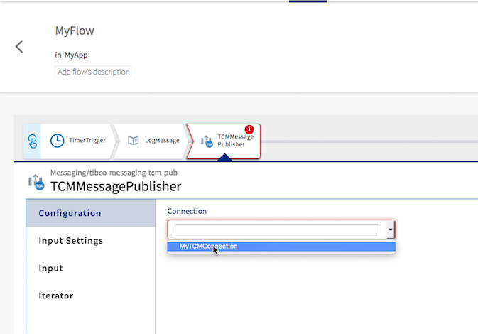 Once the connection is created, you can use it to configure the Connection field in an activity. In the example below, the connection created above is being used to configure the Connection field of the TCMMessagePublisher activity.
