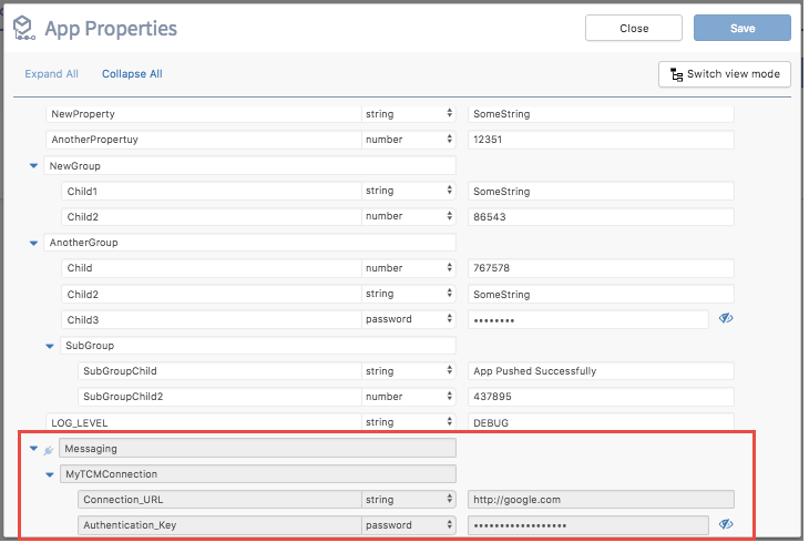 After configuring the Connection field with the connection, if you open the App Properties dialog, you should see the connection properties for the field (enclosed in the red box) displayed. Notice that only the supported properties (Connection URL and Authentication Key) are displayed in a read-only mode.