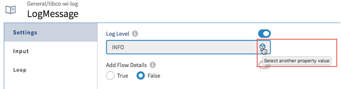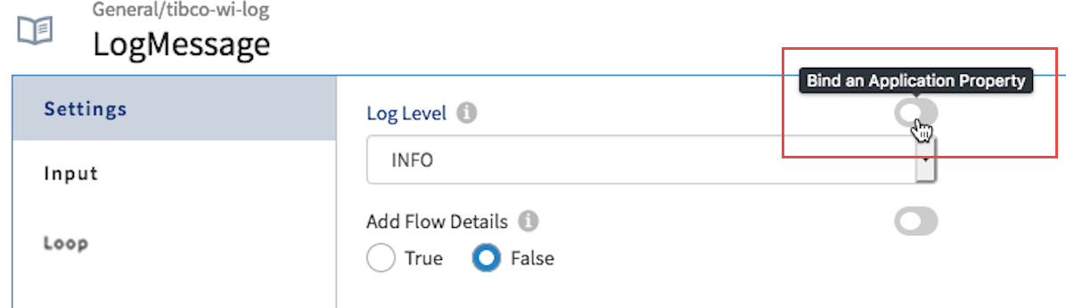 Configuring a field with an application property is recommended for fields that require their values to be overridden when the app goes into production. Hence, the decision as to which fields in an activity should support application properties (which fields can be configured using an application property) must be decided at the time when the extension for the category is being developed. The fields that can be configured using an application property display a slider button against their names in the UI.