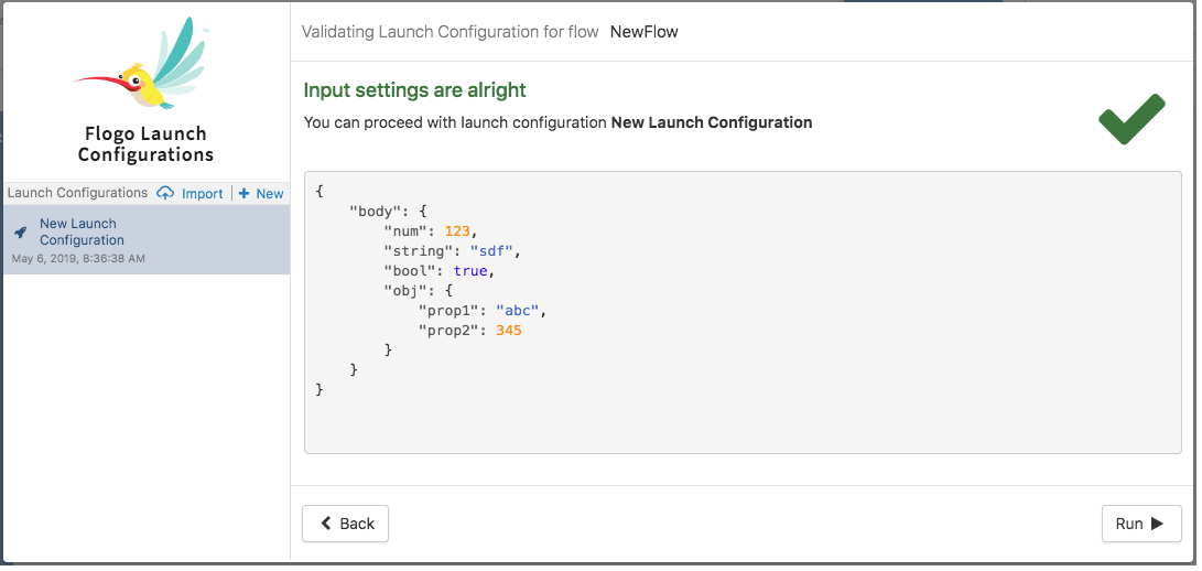 Run to execute the flow with the data you provided in the Launch Configuration.