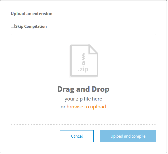 - Click the browse to upload link and navigate to your extension .zip file. Alternatively, drag and drop the .zip file from your local machine to the area defined by a dotted line in the Upload an extension dialog.