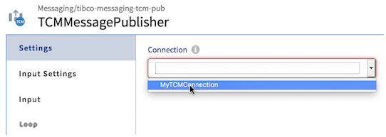Once the connection is created, you can use it to configure the Connection field in an activity. In the example below, the connection created above is being used to configure the Connection field of the TCMMessagePublisher activity.