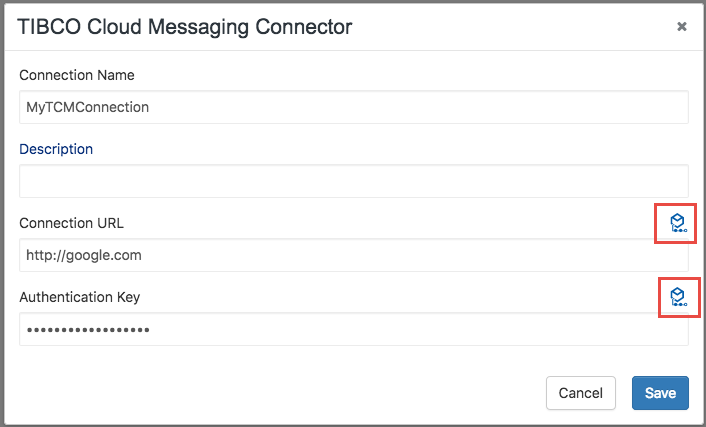 After configuring the Connection field with the connection, if you open the App Properties dialog, you should see the connection properties for the field (enclosed in the red box) displayed. Notice that only the supported properties (Connection URL and Authentication Key) are displayed in a read-only mode.