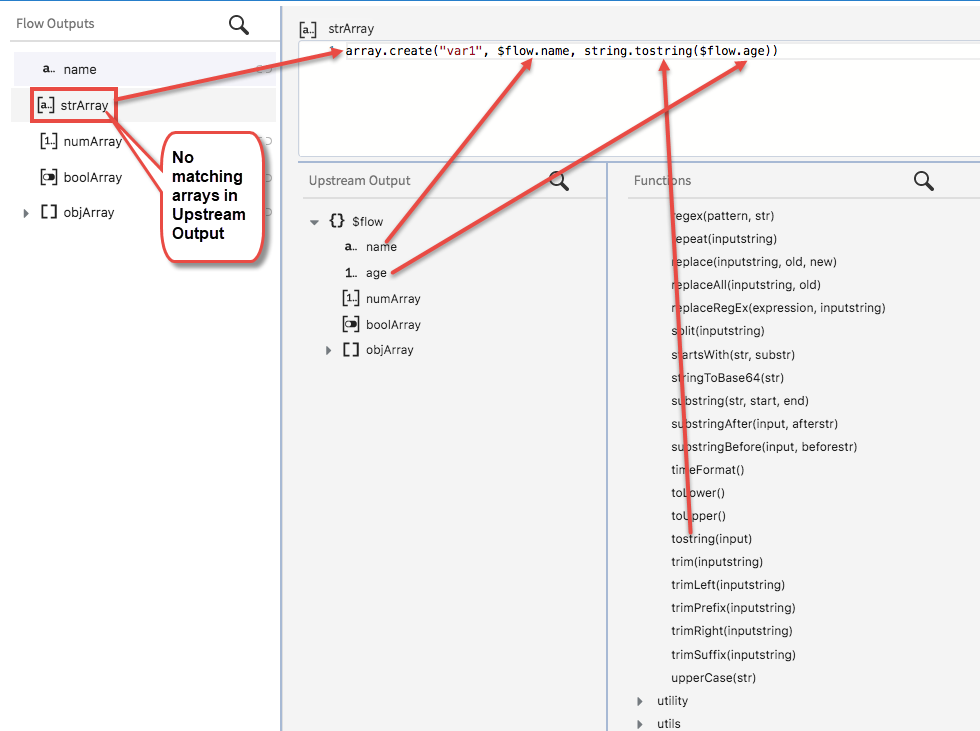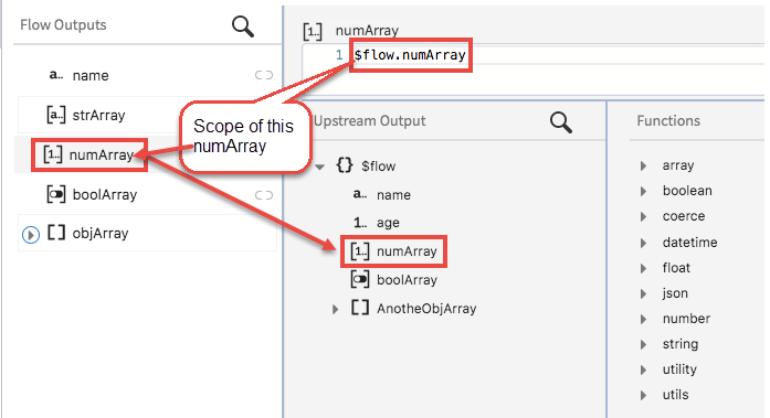 The array names need not match, but their data types must match. In Upstream Output, $flow points to numArray in Upstream Output which is the scope for numArray in the input.