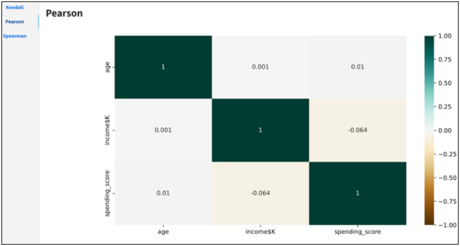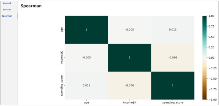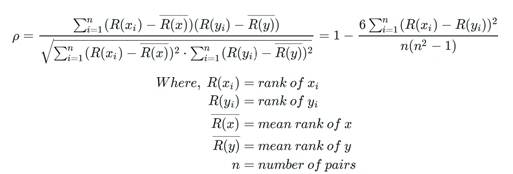 The Spearman correlation coefficient between two features is the Pearson correlation coefficient between their rank values. It is calculated the same way as the Pearson correlation coefficient, but takes into account their ranks instead of their values. It is often denoted with the Greek letter rh (ρ) and called Spearman’s rho.
