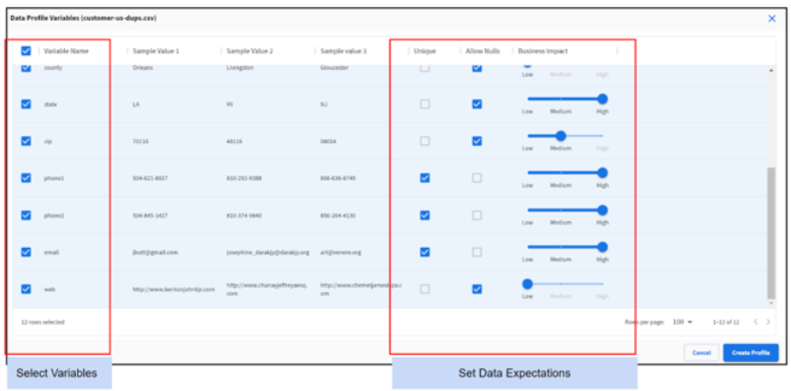 Select the variables to include in the data profile.
