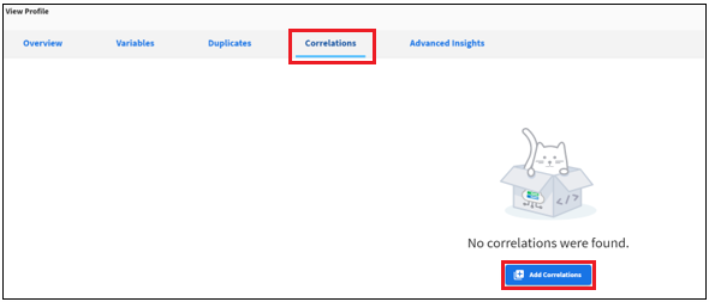 - Click the Correlations tab in the View Profile dialog, and then click Add Correlations as shown in the following image.