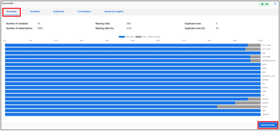 Data Profiling analysis generates insights about the technical characteristics of the input data for each of the variables selected by the user.