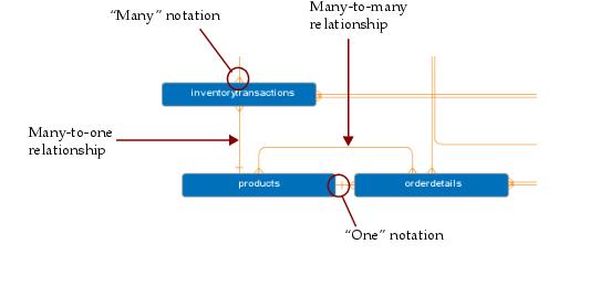 A relationship between two nodes in the model is indicated by a connecting line. The ends of the connecting line indicate the cardinality of the relationship using crow’s-foot notation.