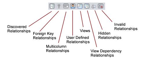 There are four types of relationships: discovered (orange), foreign key, (blue), multicolumn (brown), and user-defined (red). You can hide or redisplay the relationships by type using the buttons on the toolbar.