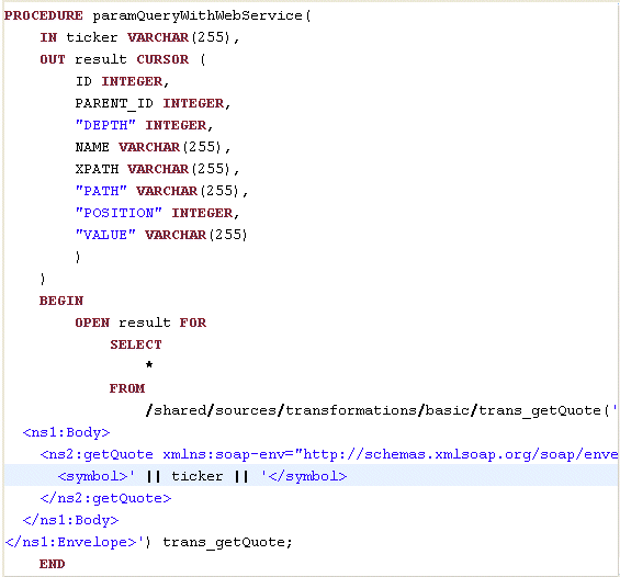 The name of the parameter (ticker) appears as the input parameter (IN) and is also included in the FROM clause.