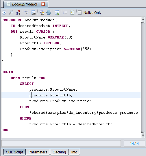 — Drag and drop tables, views, or other procedures from the Studio resource tree into the procedure editor panel. This action inserts the full TDV resource name at the drop point.