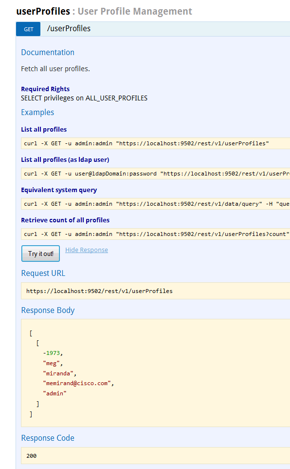 The method description expands to display its description, the rights required, examples of its use, and a Try it out! button.