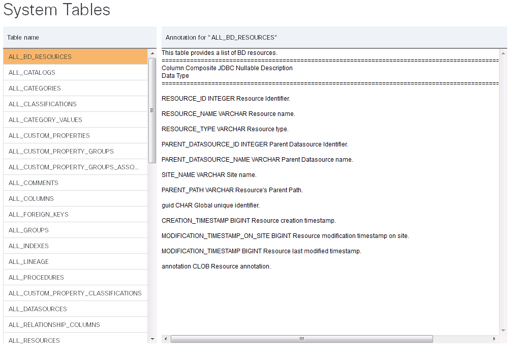 Note: System tables are virtual tables. They map to a physical database table, a view, a structure in server memory, or a combination of these. TIBCO reserves the right to change the system tables at any time.