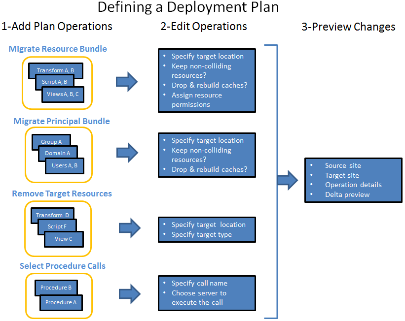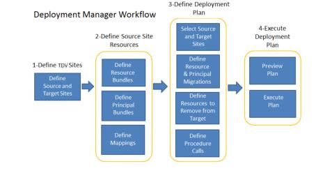 The Deployment Manager workflow can be summarized in four basic steps: define the source and target sites, define the source site resources and mappings, define a deployment plan, and execute the deployment plan. The tasks in each of these steps is illustrated below: