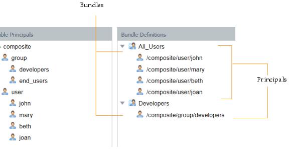 The Available Principals column contains all principals in the site that can be added to the principal bundles. To add principals to a bundle: