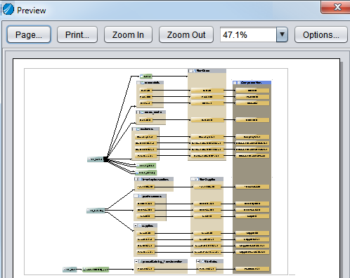 Options | Displays a Print Options dialog with three tabs: • General tab options let you create a large poster-style print of the model diagram by dividing the model into sections that can be pieced together. Poster Rows—divides the image vertically into the number of rows entered and displays how it would appear on that number of pages if printed. Poster Columns—divides the image horizontally into the number of columns entered and displays how it would appear on that number of pages if printed. Add Poster Coordinates—prints the location of each subsection of the model diagram so that you can figure out how the sections go together. Clip Area—Two options are provided: Graph enlarges the model image as much as possible within the margins; View increases the blank space around the model image. • Title tab options let you specify a title for the printed model. Text—Specify the title you want to appear at the top of the model diagram. Titlebar Color—Click to select the color of the title bar which will appear behind the title text. Text Color—Click to select the color of the title text. • Footer tab options let you specify a footer for the printed model. If you are printing the model poster style, the footer will span the pages appropriately. You can specify text, footer and text color. |