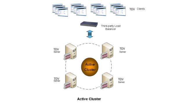 Clients typically connect to a third-party load balancer that forwards each connection request to the next available node. However, Active Cluster does not require a load balancer and it has no programmatic awareness of the load balancer. All configuration with a load balancer is performed outside of Active Cluster.