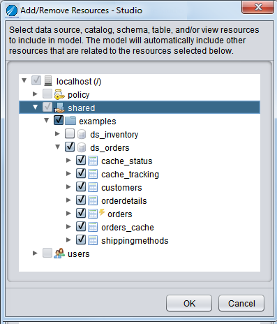 You can add and remove resources, including entire data sources or specific tables from within the model. When you remove resources from a model, the resources are still available in TDV and can be re-added at any time. Be sure to use the procedure below to remove resources.