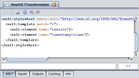When you add target output columns through the Outputs panel for XSLT transformations, the XSLT in the XSLT panel is not automatically updated. You must manually update the XSLT.