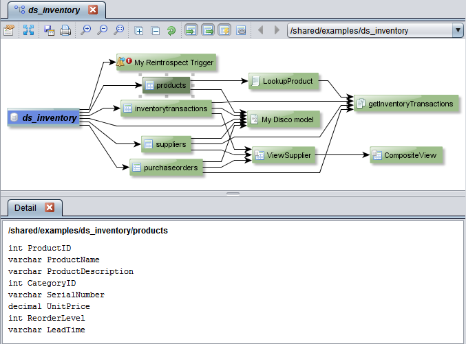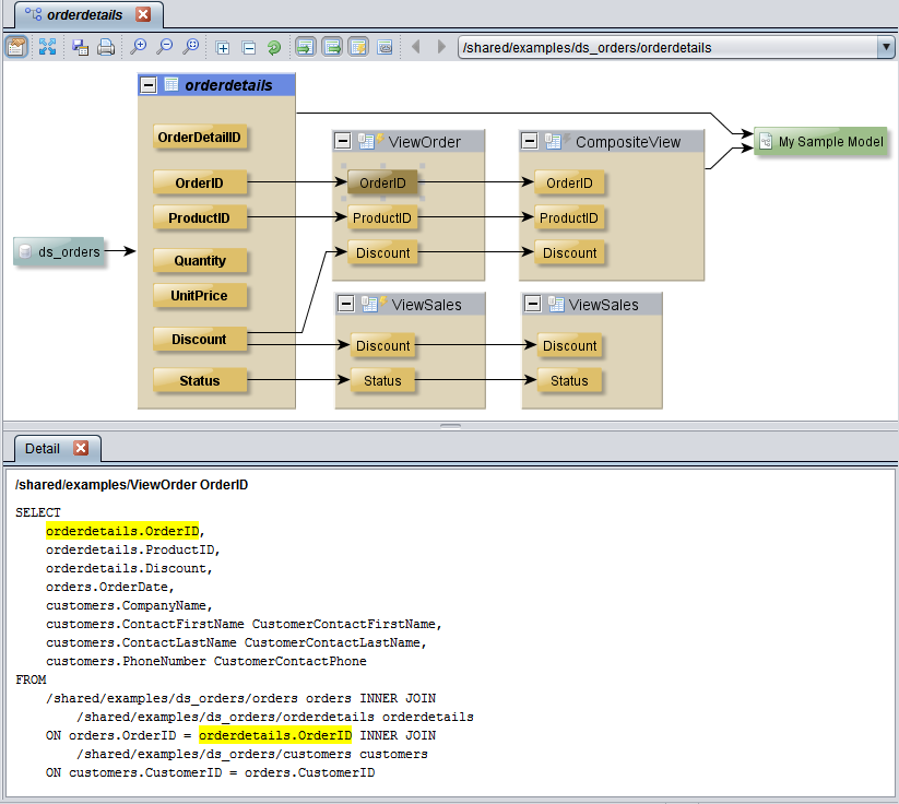 For example, when you double-click a view to display its columns, the columns and their relationships are displayed and the Detail panel shows the SQL that defines the view. If you select a column, then the references to the column are highlighted in yellow as shown in this example: