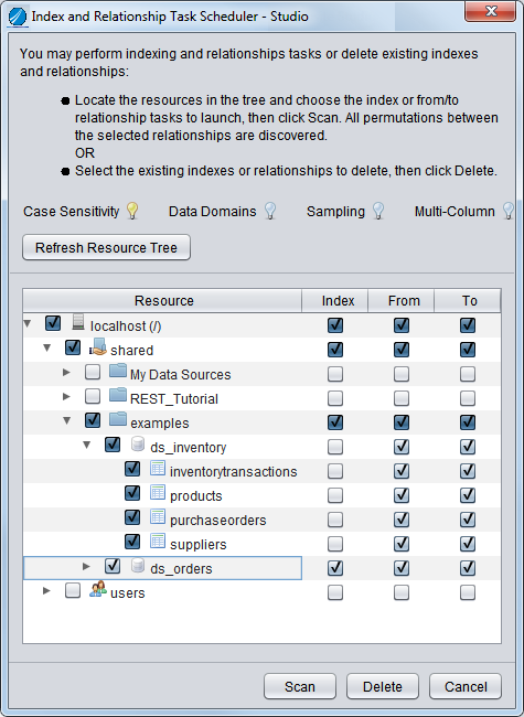 Discovery displays the Index and Relationship Task Scheduler dialog with no boxes checked.