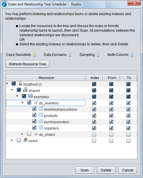 次の例のように、検出により、このデータソース内の関係にインデックスを付けて検出するためにすべてのチェックボックスが選択された[インデックスと関係タスクスケジューラ]ダイアログが表示されます。