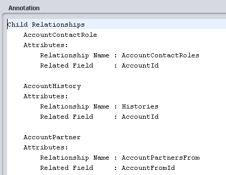 This information is for user information only and cannot be edited. If the Annotation field is empty, no child relationships exist for this table.