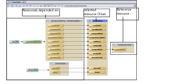 Studioに、選択したリソースの系列(すべてのリソース依存関係とすべての参照リソースを含む)が表示されます。この例は、ViewSalesサンプルビューのデータ系列を示しています。